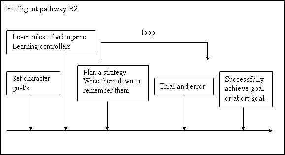 In intelligent pathway B2, the player has to set goals in terms of the type of video game played and based on the player’s goals in the game. Next, in the video game are various rules and boundaries the player has to follow. Then, the player has to also know what buttons control what actions in the video game. When playing a video game, the controller controls the actions of a character/s on the monitor the robot is seeing. On the other hand, if the robot was playing a real sports game, he has to use his body to take action.